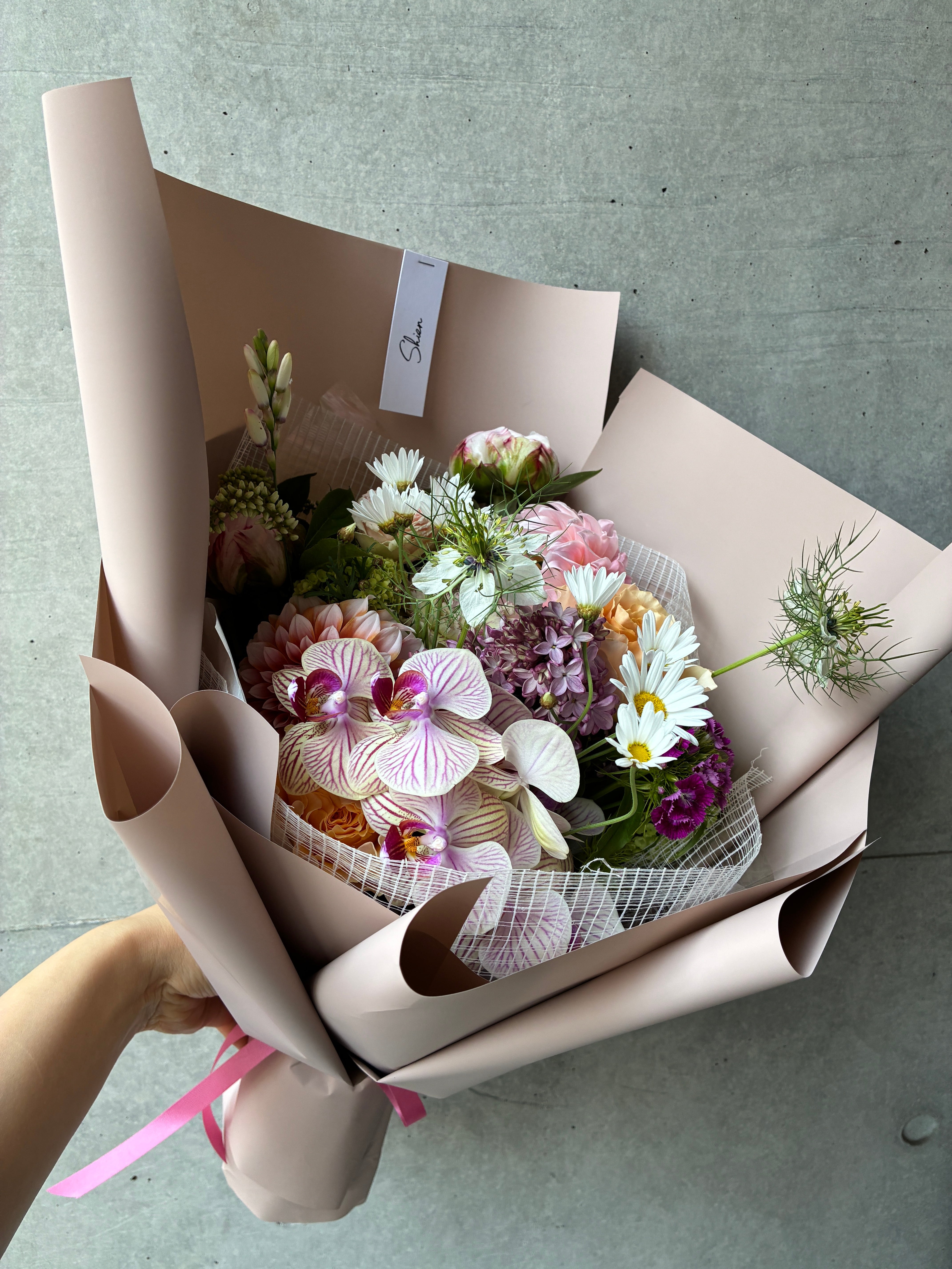掲載写真はサンプルイメージです。 その日の仕入れ状況に合わせて、旬の花を選び、ひとつひとつ心を込めてお作りいたします。