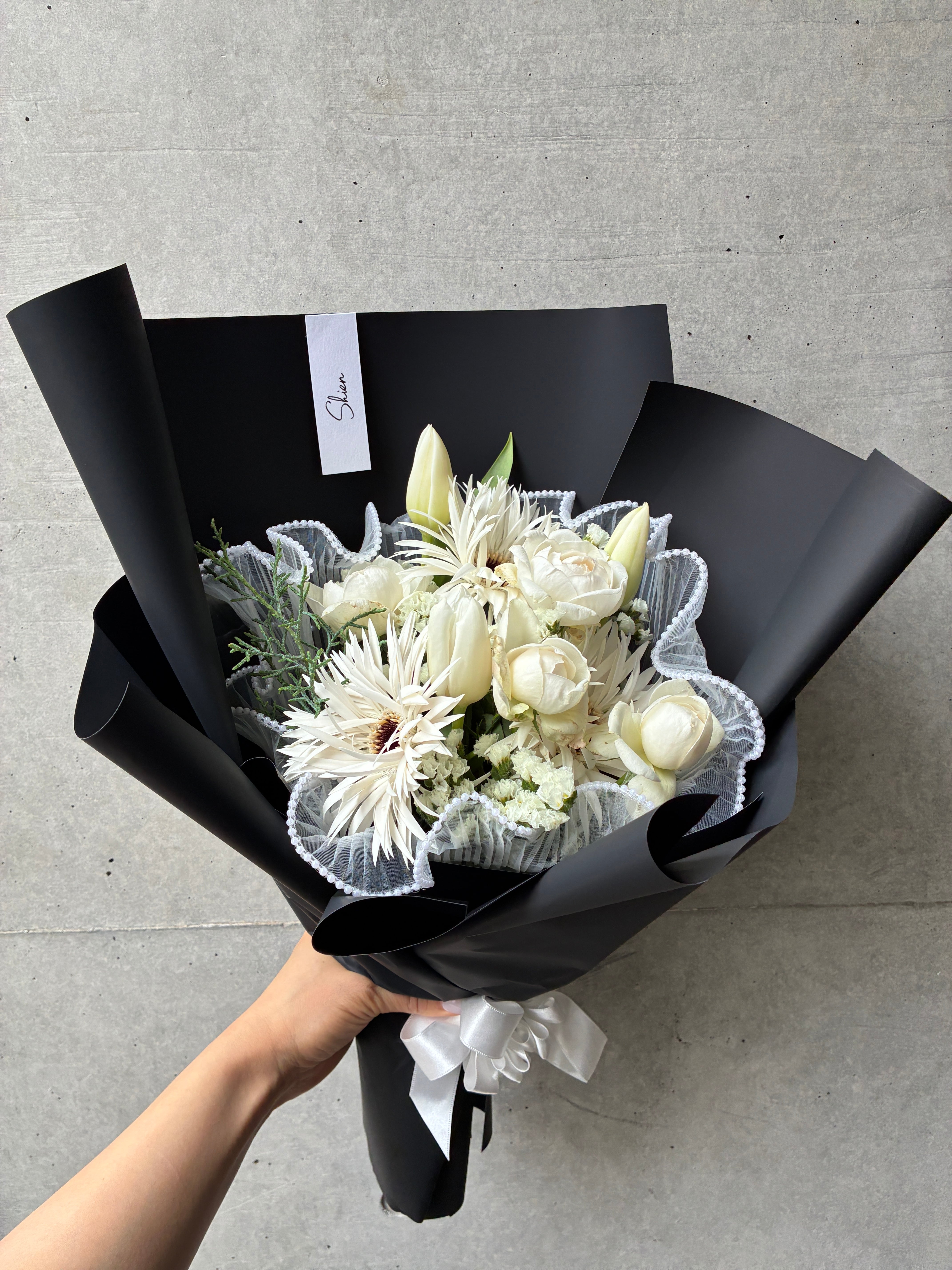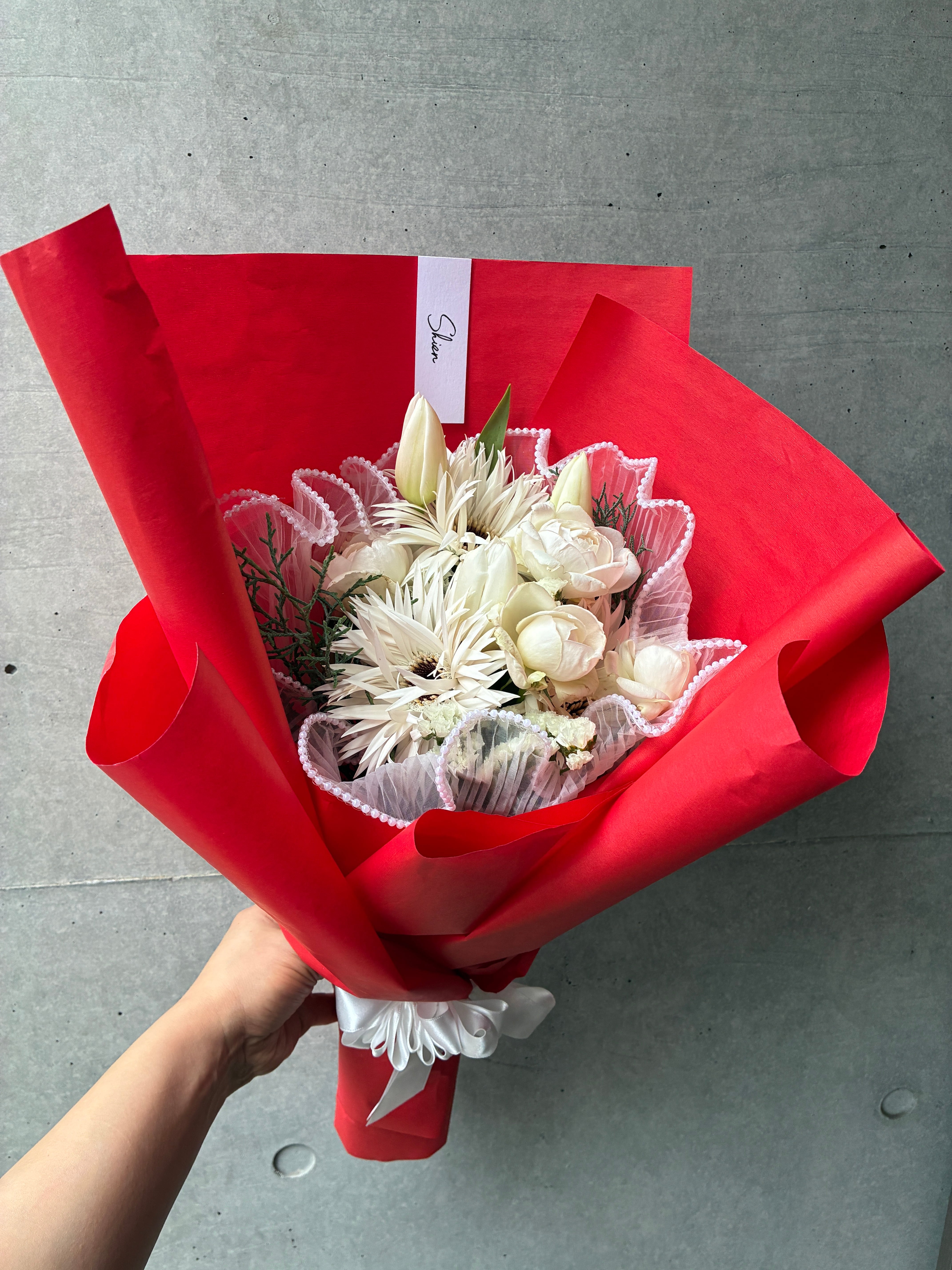ウィンターシーズンらしいホワイトをテーマに束ねパール付きレースラッピングでレディに仕上げた限定ブーケです。オプションで人気のアーティフィシャルフラワーや話題のハイブリッドスタイルに花材の変更が頂けます。