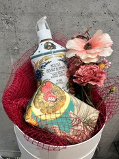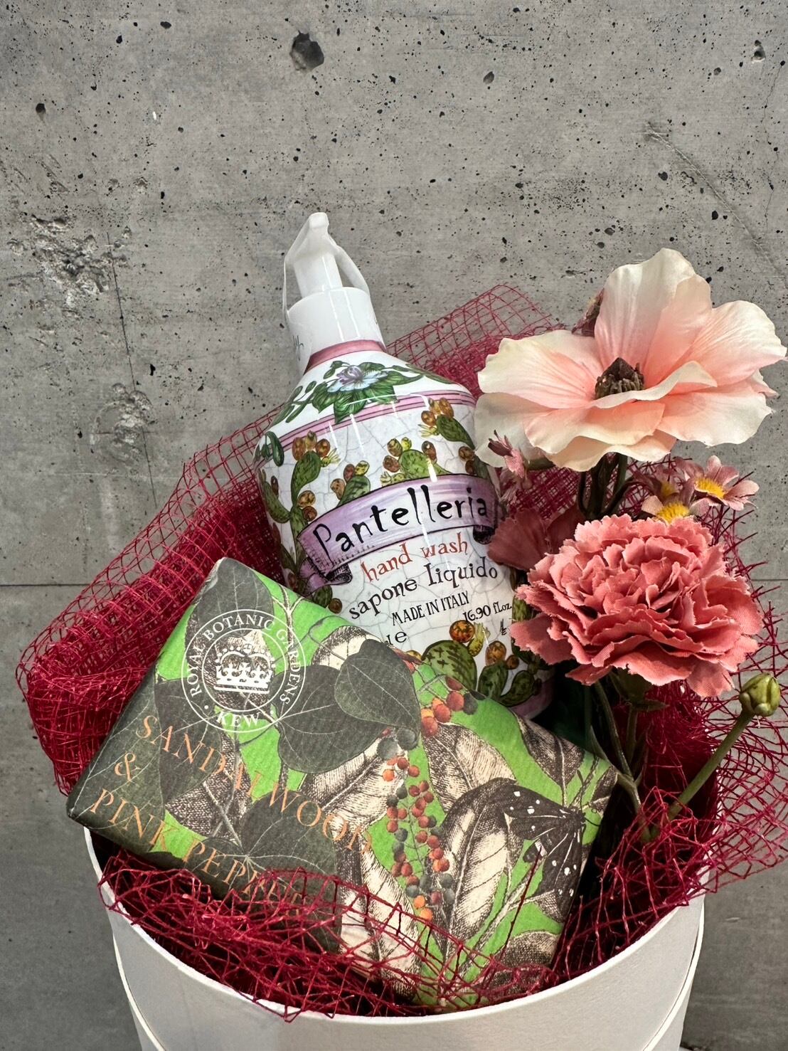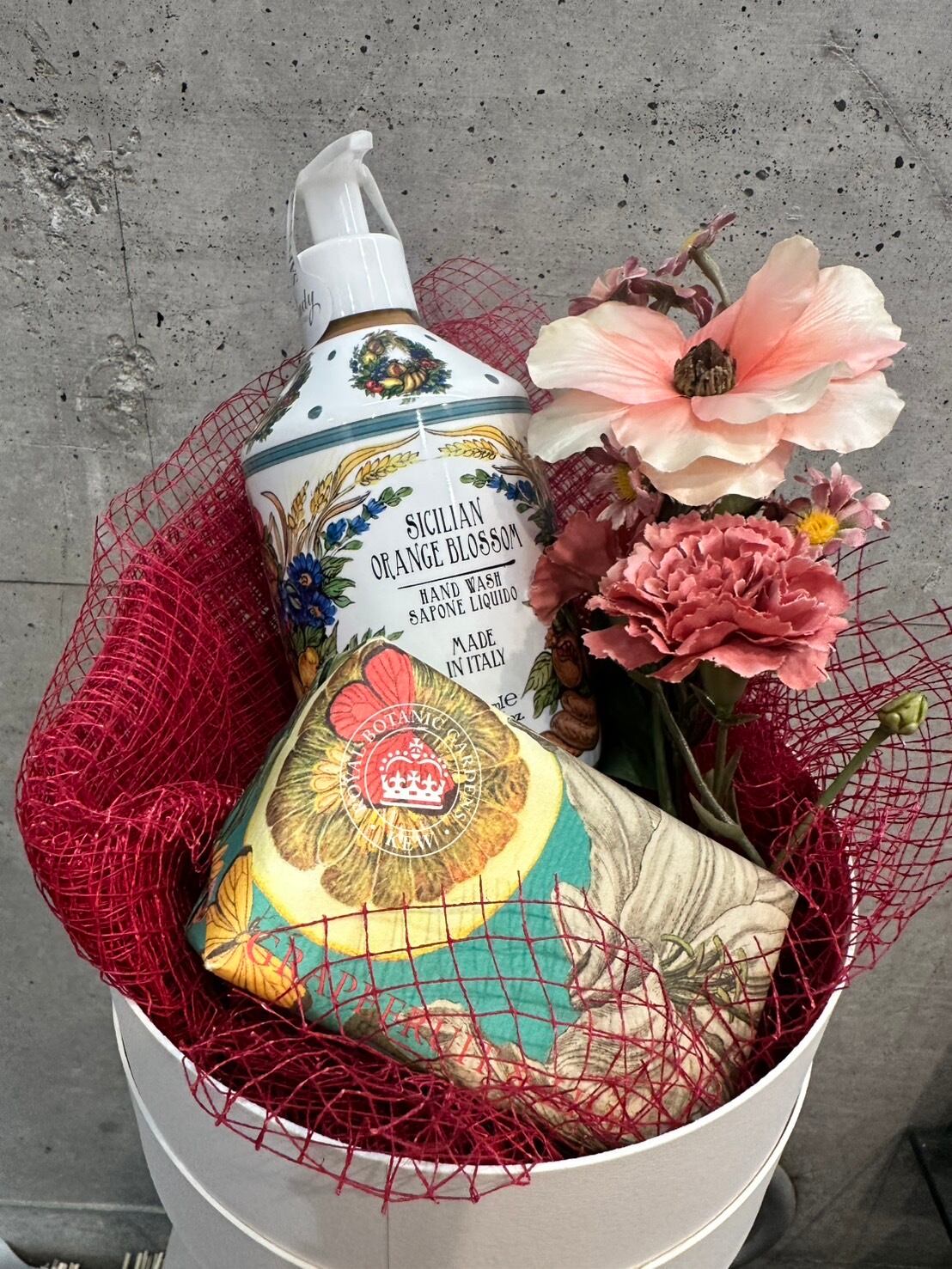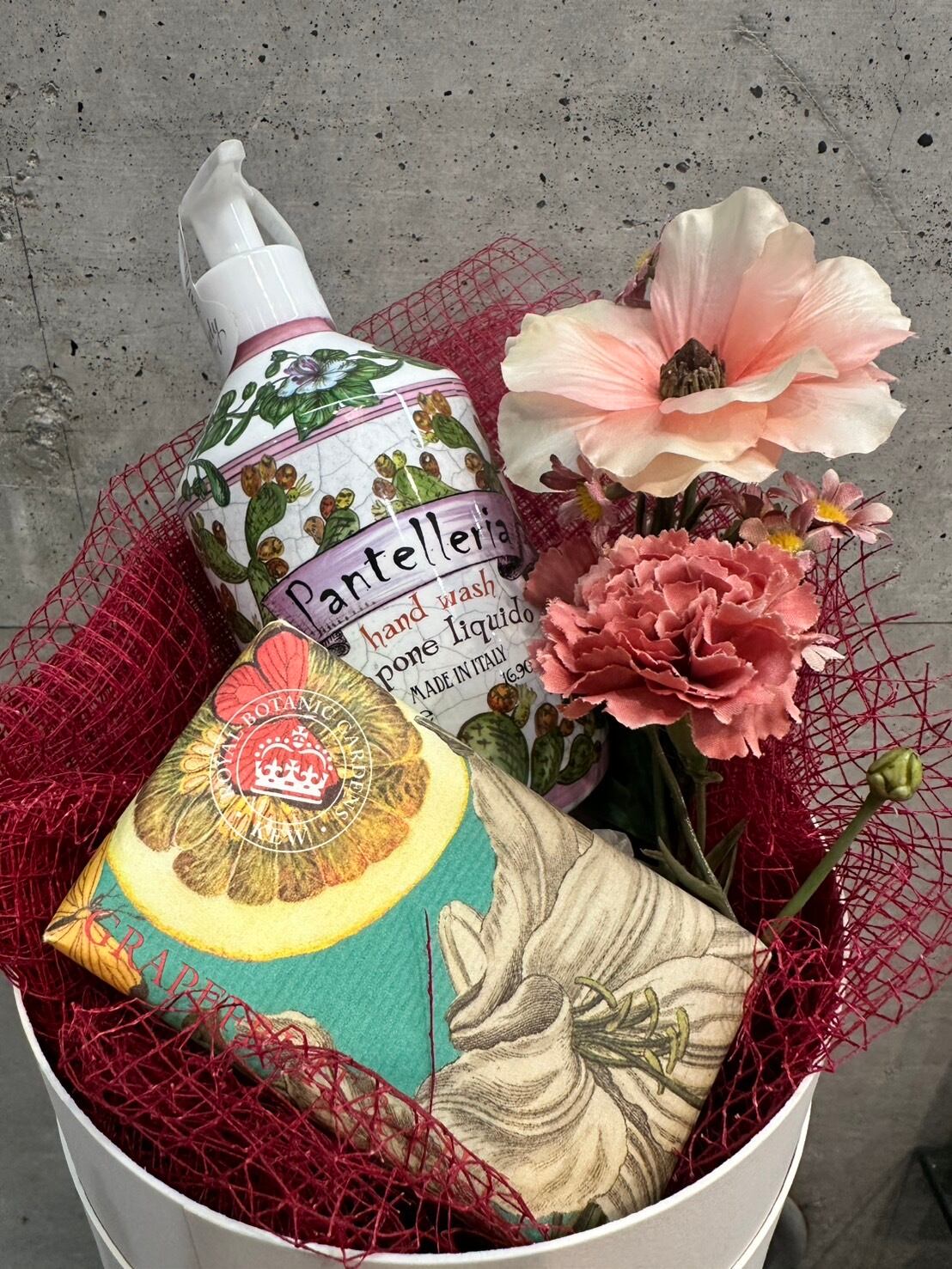 イタリアの伝統的なマヨルカ焼きをイメージした美しいパッケージ Royal Botanic Gardens Kew(キュー王立植物園)のハンドソーのセットにアーティフィシャルフラワーなどを入れたシエフラワーオリジナルの福袋セットです。