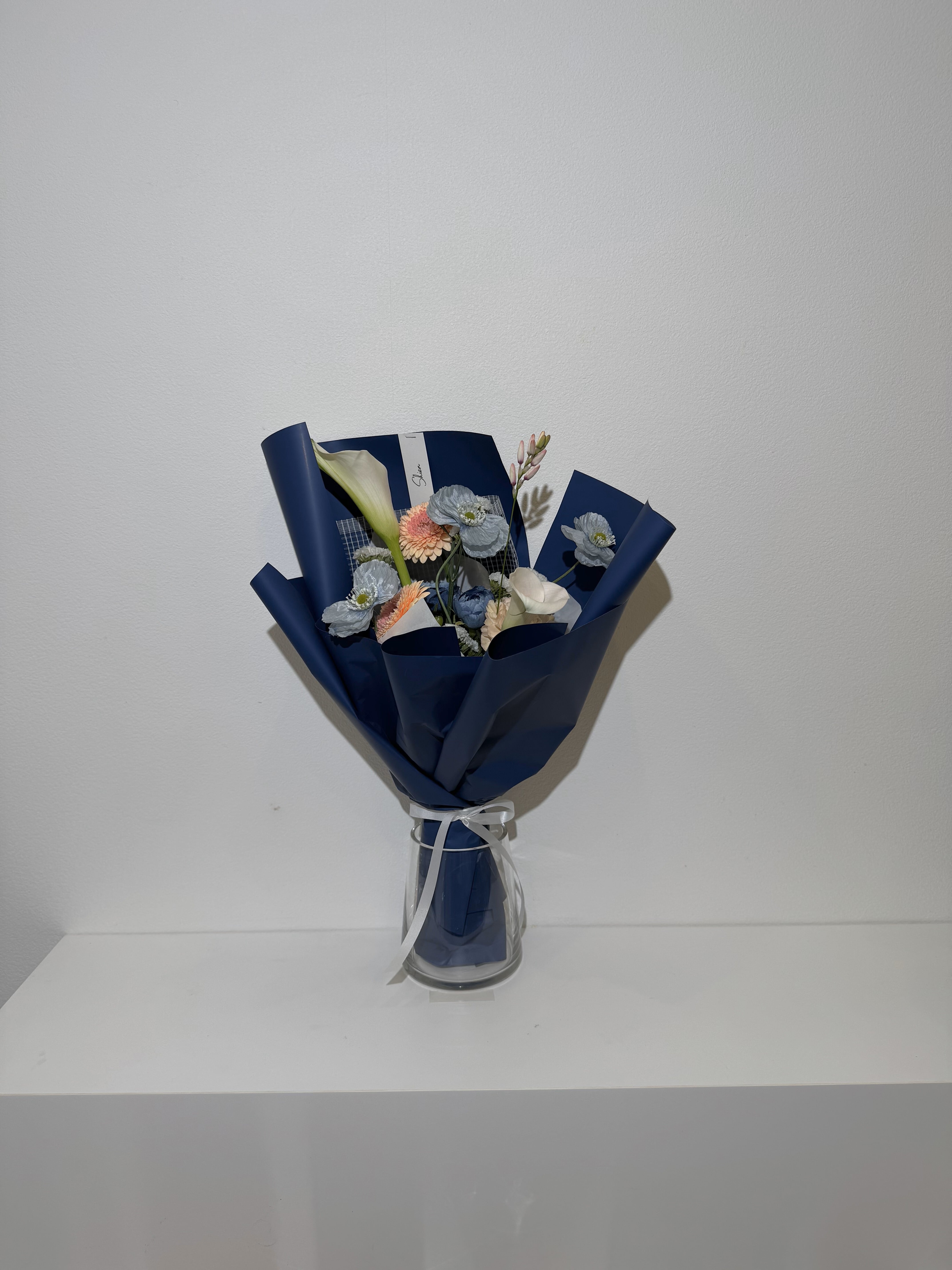 マニッシュなブルーをテーマにした生花とアーティフィシャルフラワー(高品質な造花)を組み合わせた、ハイブリッドブーケです。
