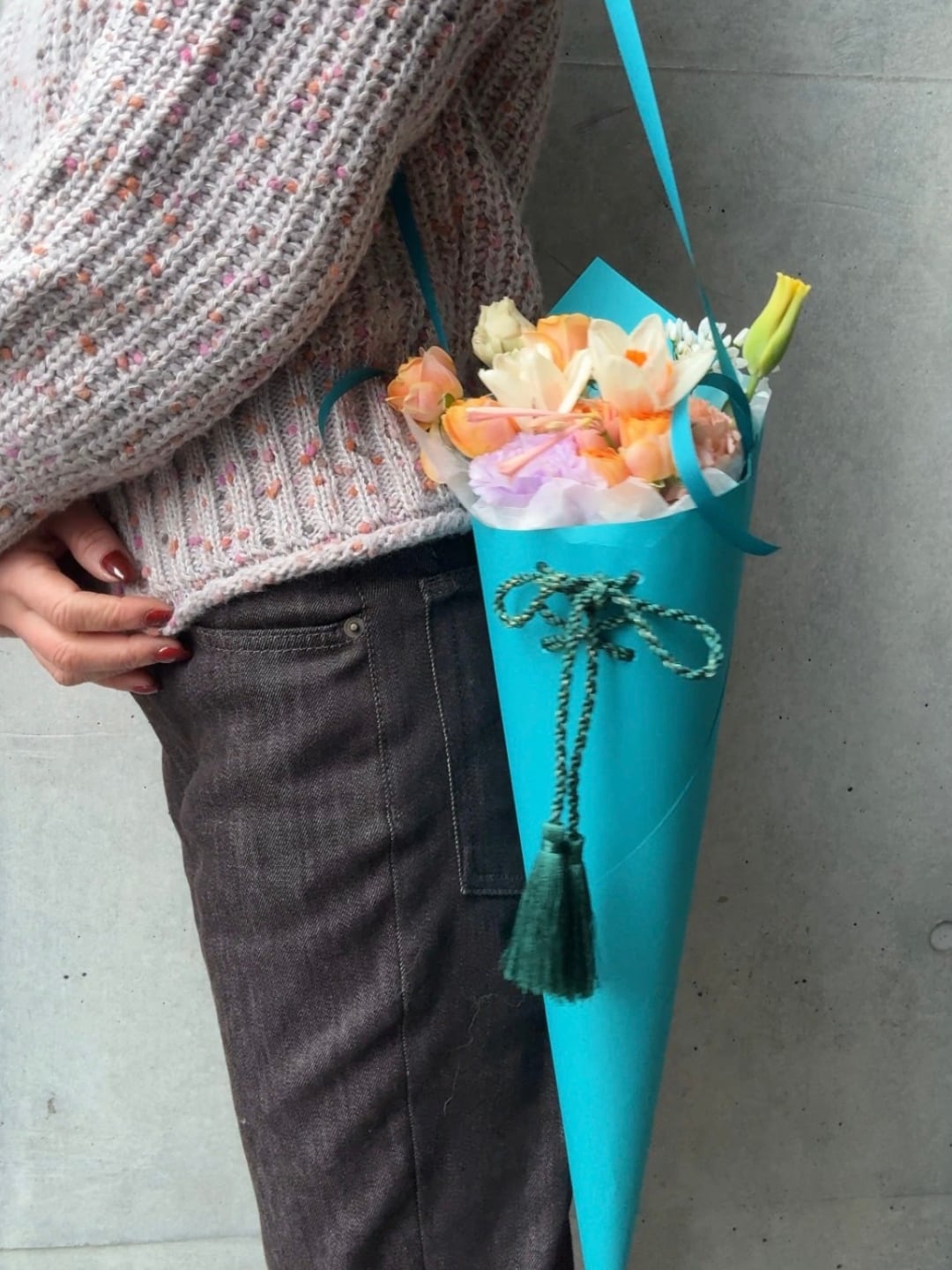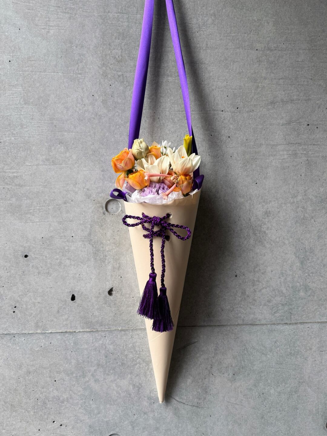 今回の肩掛けラッピングの花束は、制服にも和装に似合う卒業の喜びを彩る特別な商品です。