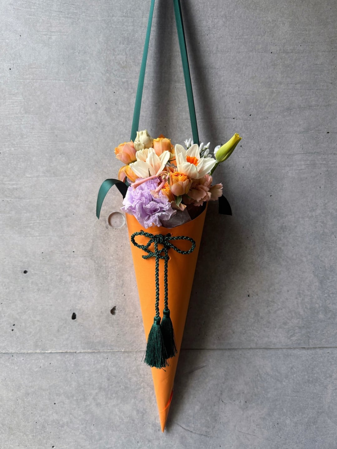 強く結ばれた紐のように、つながりを深める限定ラッピングを数量限定でご用意しました。組紐や結びは古くから人生の節目や特別な瞬間に使われる縁起の良いモチーフとして大切にされてきたもの今回の肩掛けラッピングの花束は、和装に似合う成人式の喜びを彩る特別な商品です。