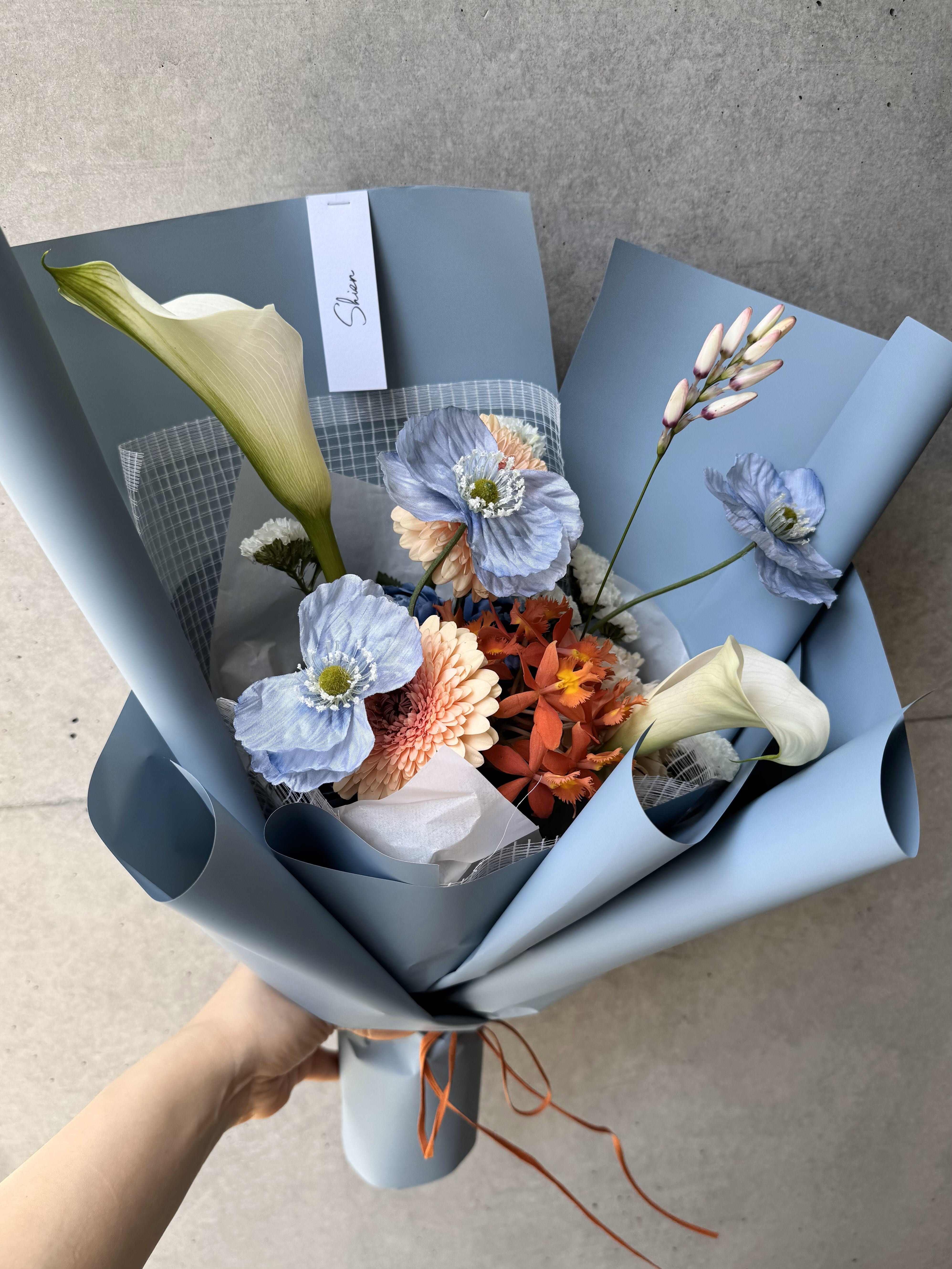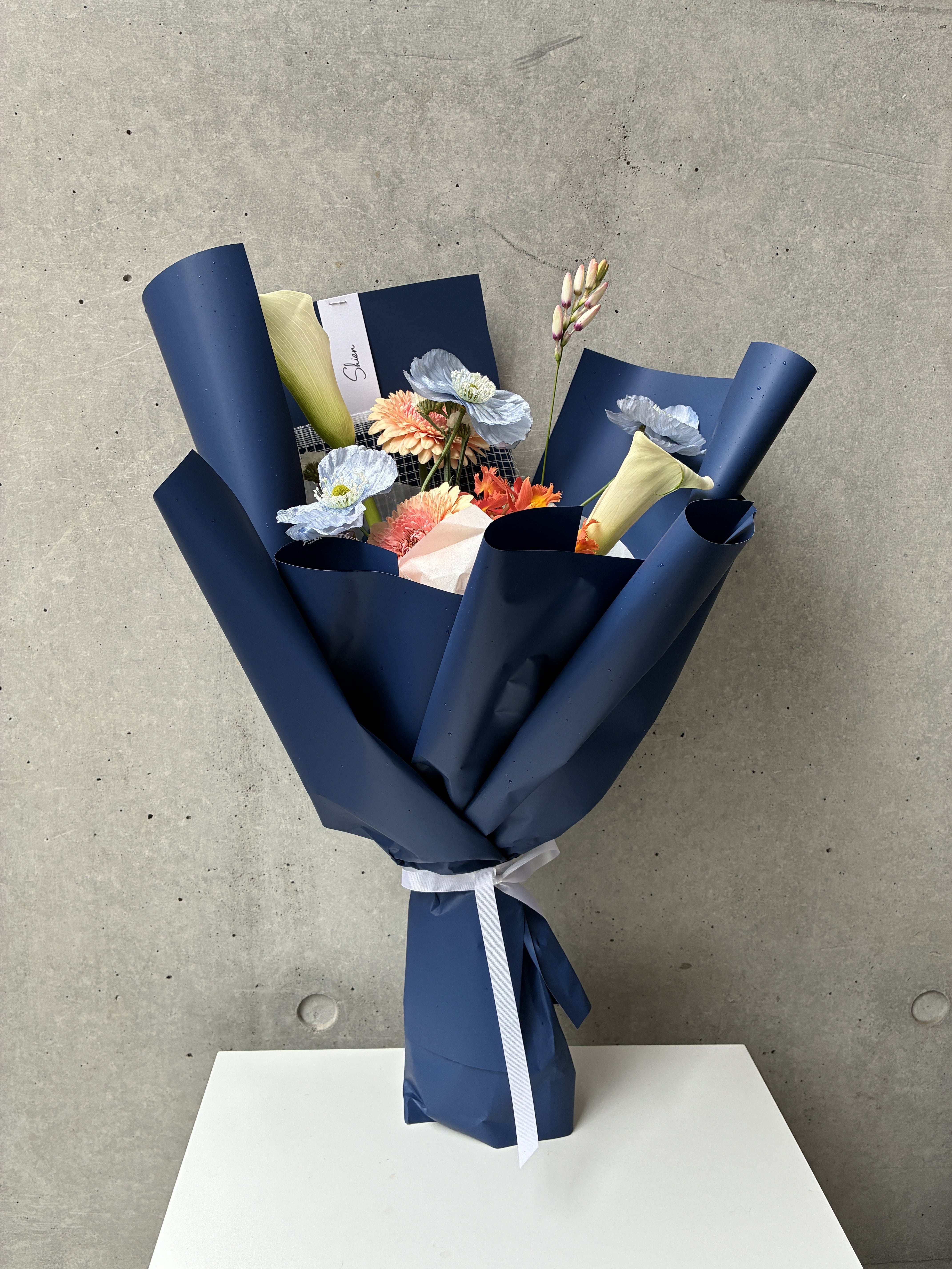 マニッシュなブルーをテーマにした生花とアーティフィシャルフラワー(高品質な造花)を組み合わせた、ハイブリッドブーケです。