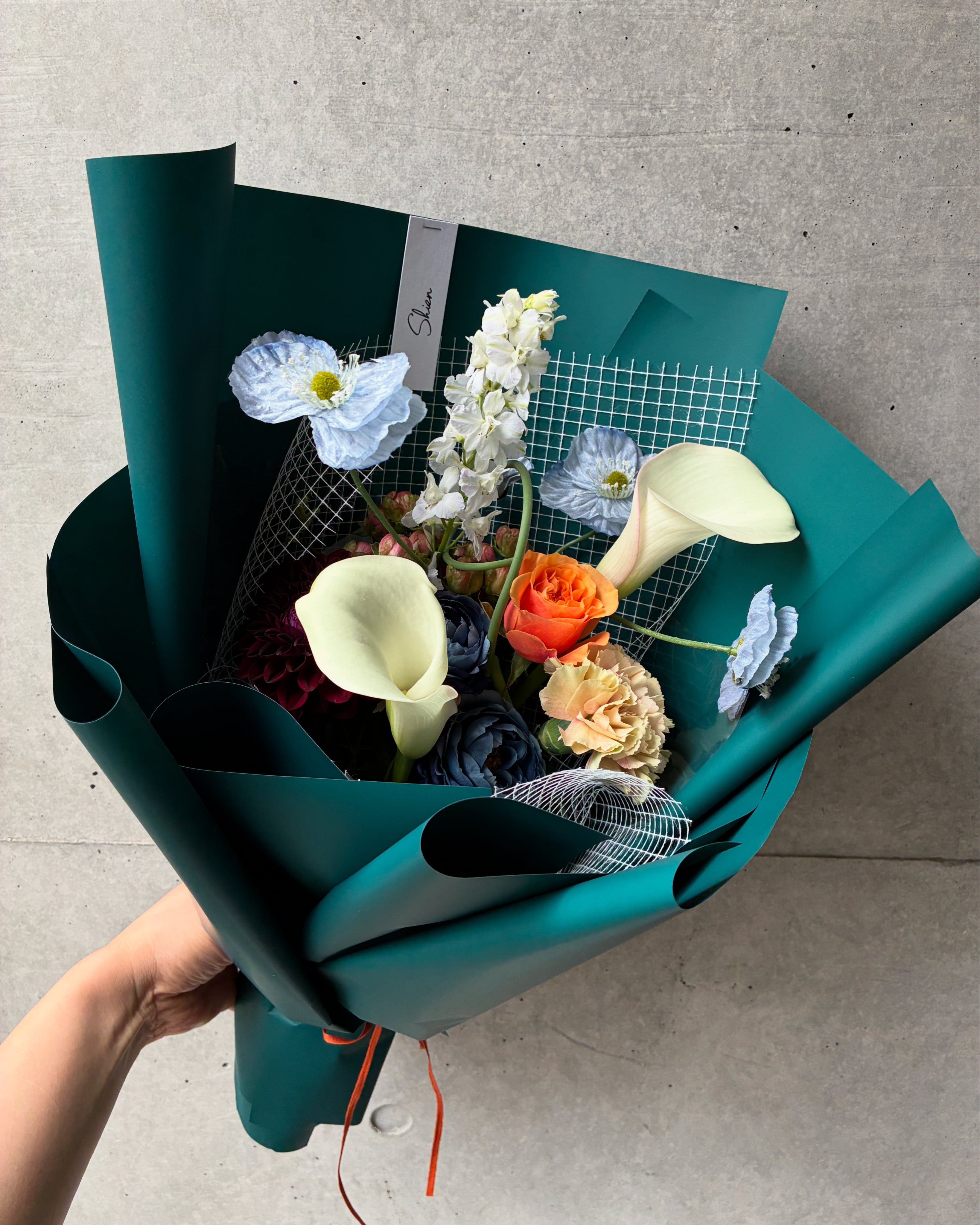 マニッシュなブルーをテーマにした生花とアーティフィシャルフラワー(高品質な造花)を組み合わせた、男性に贈りやすいハイブリッドブーケです。